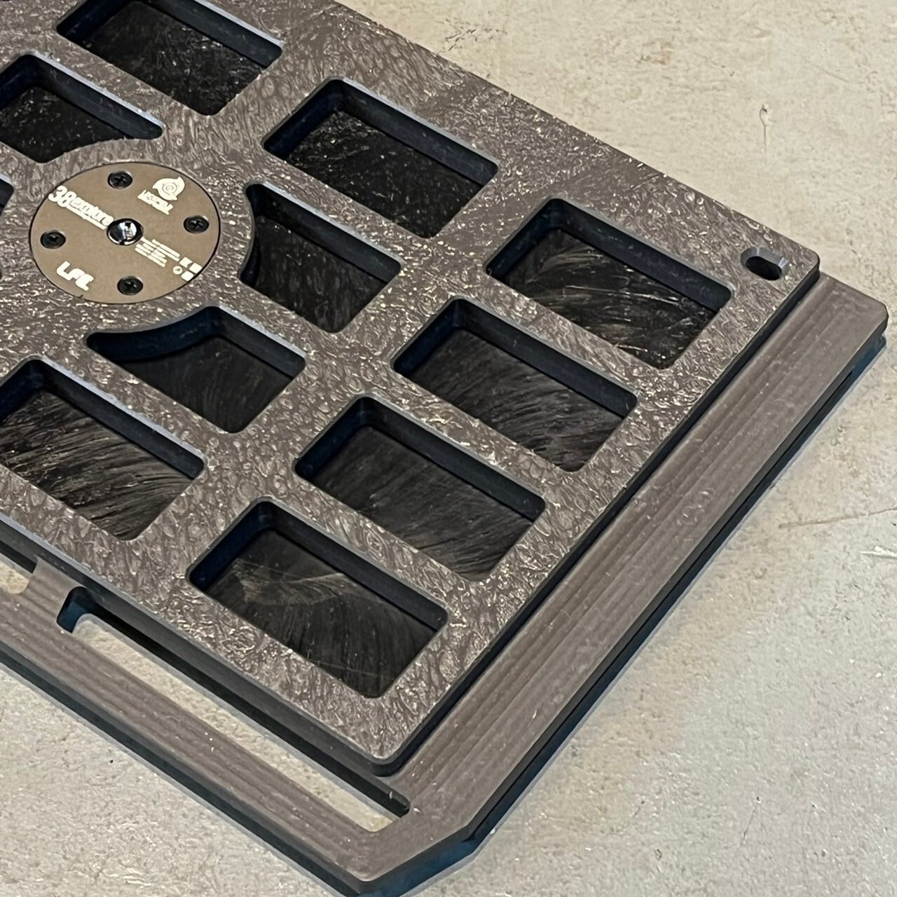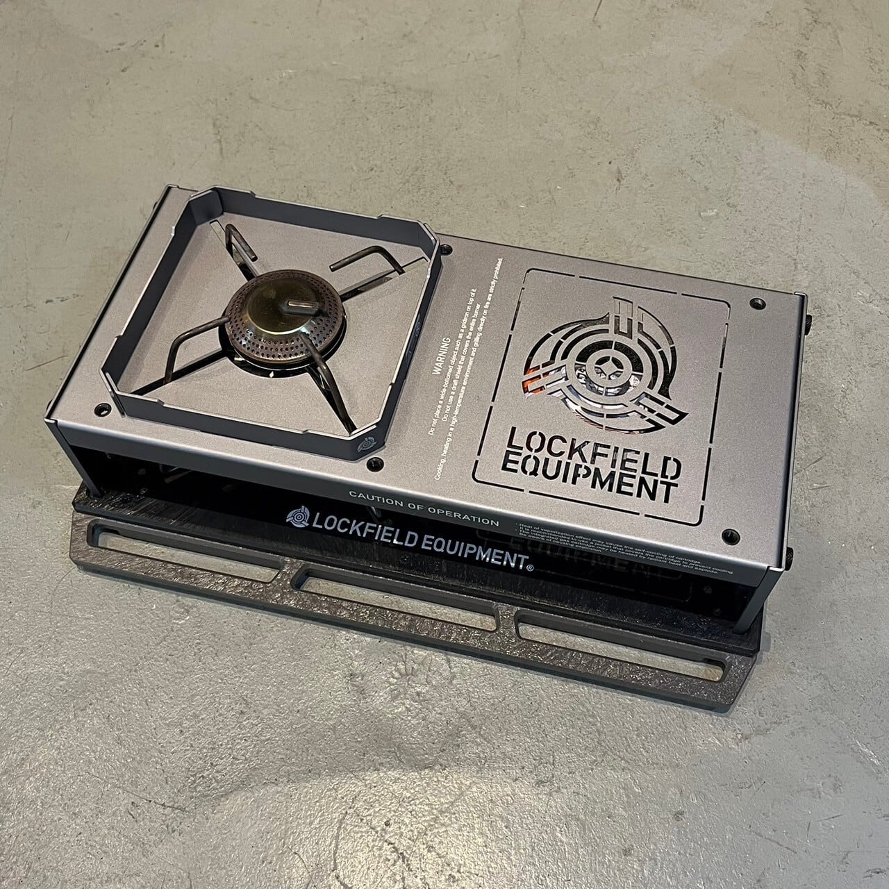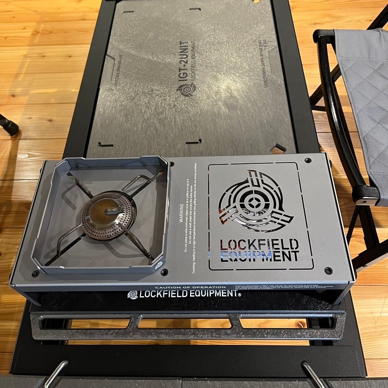 このUNITはIGT使用がメインテーマではございません。RST650+SOTO310/340のセッティング時にご使用いただけるキッチンテーブルになります。SOTOシングルバーナーやRST650はバックパックやツーリングを想定したミニマム装備。そうなるとテーブルも出来るだけ小さく携行性の高いモノを考えたい。そこでRST650+αのサイズの天板にL字の凹みを設け、小さくても天板から外れないよう工夫を施しました。裏面にセッティング済みのアシノプレートに三脚を装着してご使用ください。